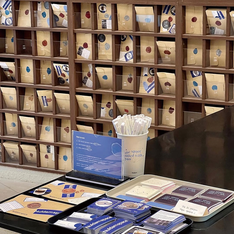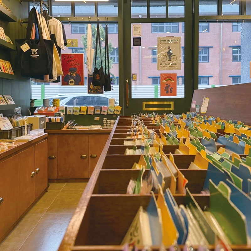 감성적인 일러스트 엽서부터 독특한 캐릭터 엽서까지 3,200여 장이 전시된 이곳은 책 대신 엽서가 가득해 엽서 도서관을 방불케 한다. 엽서를 작성할 수 있는 1인용 책상과 책과 소품, 구매한 엽서 등을 언제든 다시 꺼내볼 수 있는 기록보관함도 있다. 주말에는 사람들로 북적여 테이블에 앉기 위해 줄을 서기도 할 만큼 명소가 되었다.