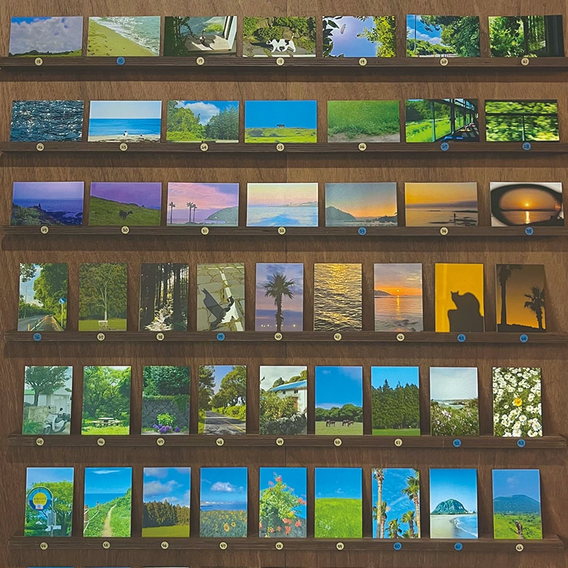 제주도 풍경 사진을 기반으로 한 다양한 엽서 및 소품들을 주로 다루고 있는 가게. 사진과 글을 좋아하는 사람들이 이 공간에 머무르면서 사색하거나 대화를 나눌 수 있는 바 테이블도 마련되어 있다. 엽서와 함께 엽서에 담긴 이야기를 같이 제공받고 싶다면 엽서세트를, 엽서 구매만 희망한다면 주문지에 원하는 엽서 번호를 적고 엽서에 담긴 이야기는 제공받지 않는다고 말하면 된다.